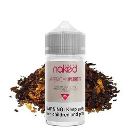 Naked vape juice flavor American Patriots vape juice has a base of 65 percent vegetable glycerin (VG) and 35 percent polypropylene glycol (PG), offering vapers a nice throat hit and a smooth, refreshing taste. Give Naked 100 American Patriots e-juice a whirl to satisfy your tobacco flavor cravings.