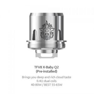 SMOK V8 X-Baby Q2 Replacement Coil, 0.4ohm dual coils, supports 40 – 80W wattage (best for 55-65W), which brings you deep and rich cloud taste. SMOK X-Baby Q2 Core is specially designed for TFV8 X-Baby.